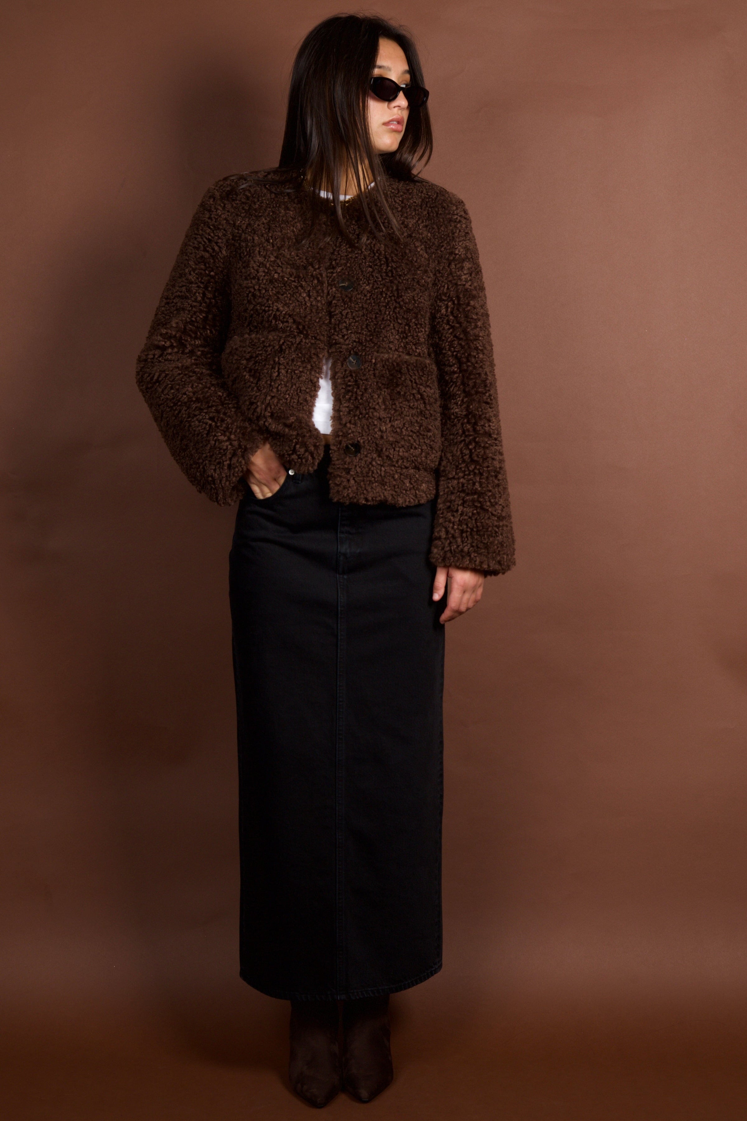Effortlessly refined, the EMILIA Sherpa Jacket blends texture and polish for a modern take on cozy dressing. Crafted from soft curly sherpa, it features a rounded neckline, tonal button closure, and subtle front pockets for a polished yet plush finish. The cropped length makes it perfect for balancing proportions, whether styled with denim or elevated tailoring.