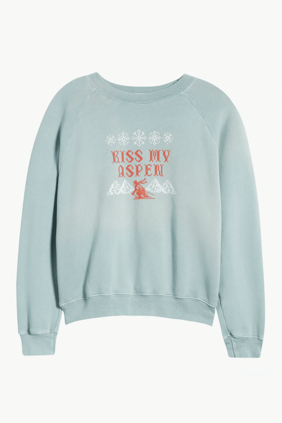An altitude essential brings winter wit. 'Kiss My Aspen' lands in a cross-stitch inspired design as your perfect complement to a fireside spritz.