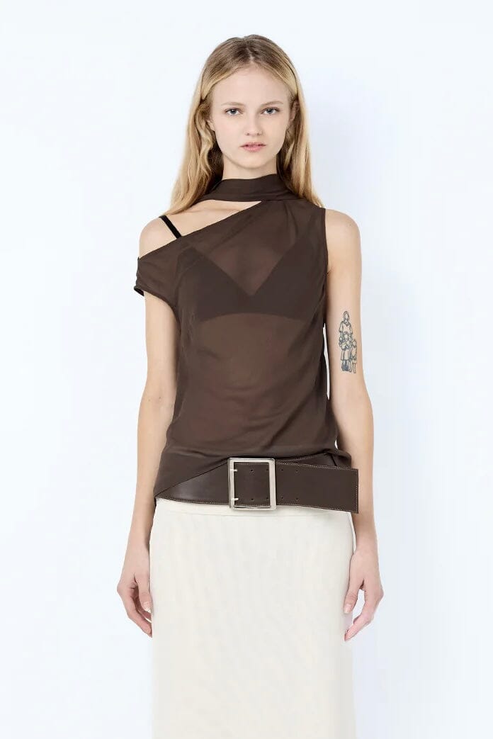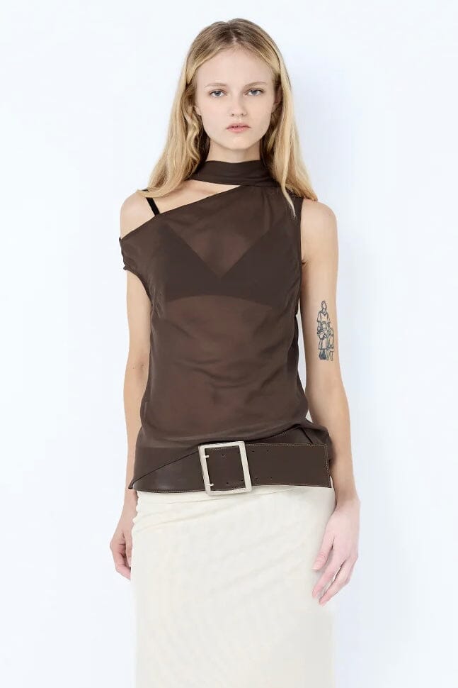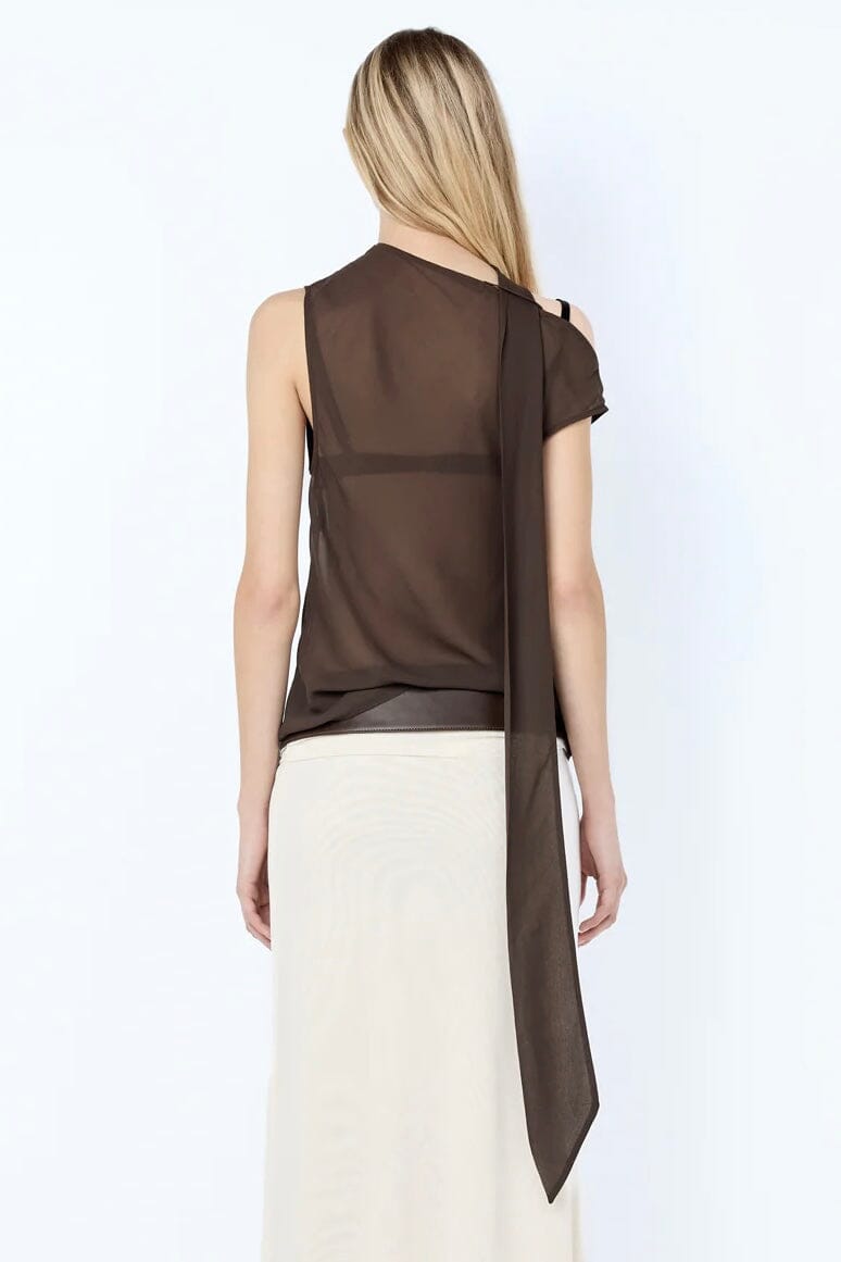 Augustin Scarf Top in Dark Choc. A delicate single-layer georgette top featuring an asymmetric neckline and sheer finish, styled with a chic neck scarf for a sophisticated, elevated look.