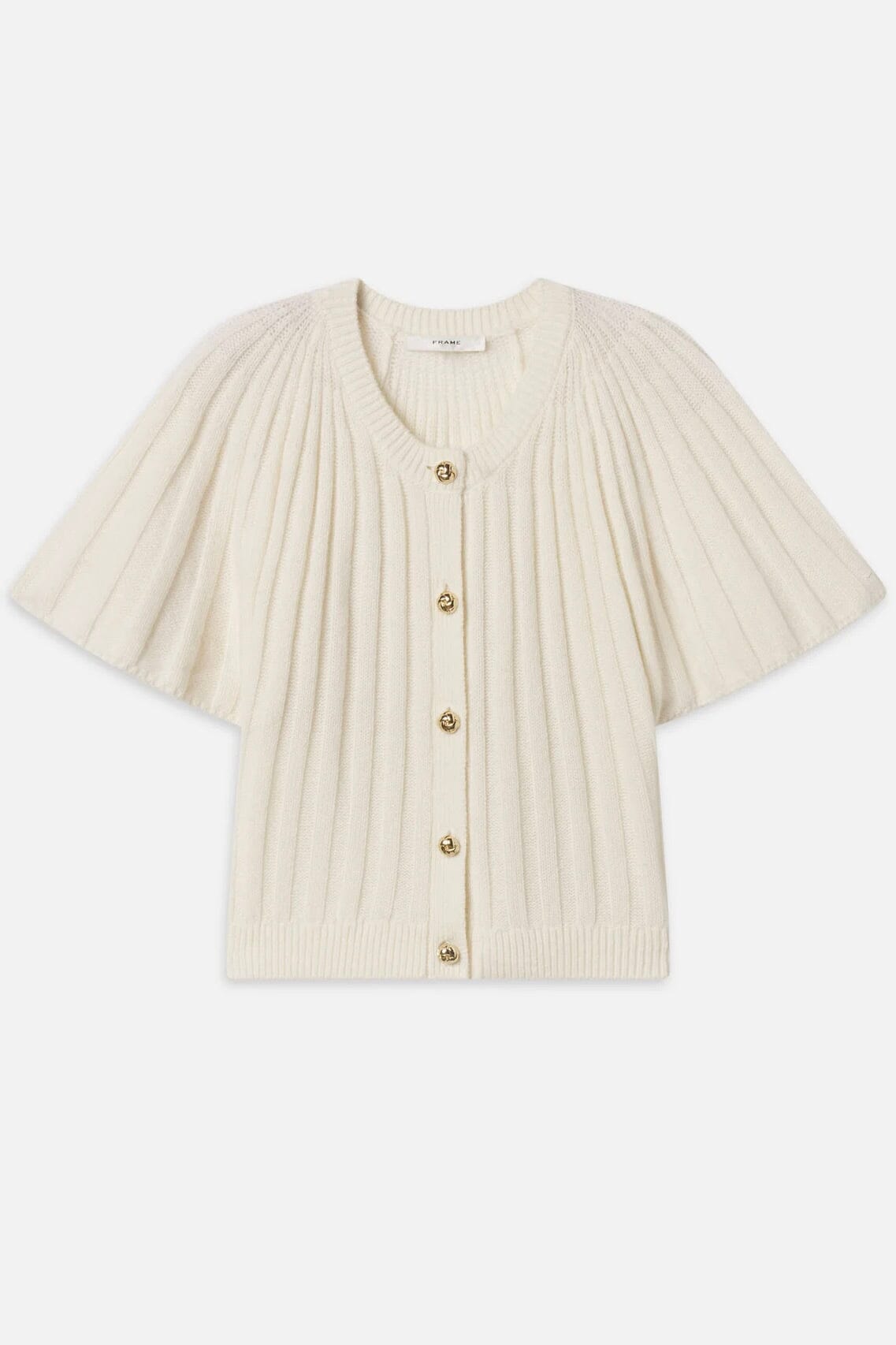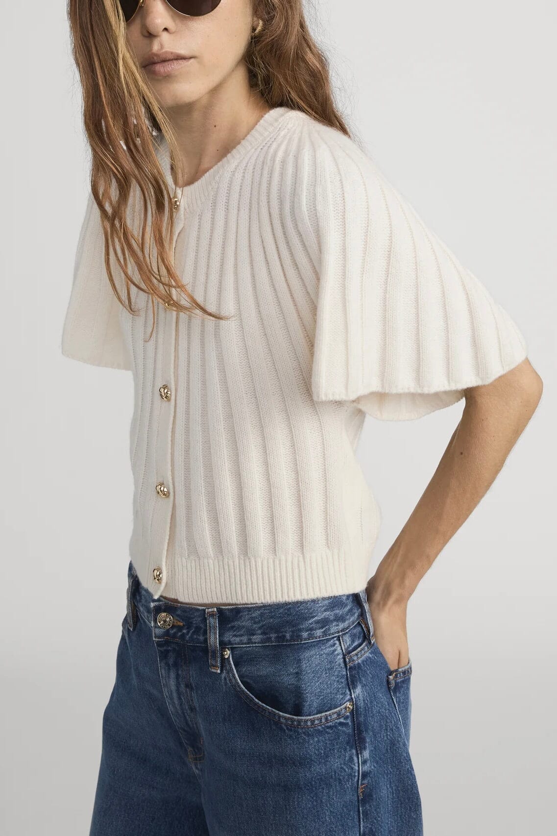 The Flutter Cardigan is crafted from a luxe wool-cashmere blend with a loose rib knit, featuring flutter sleeves and gold knot buttons—designed to be worn as a top or layered as a cardigan.