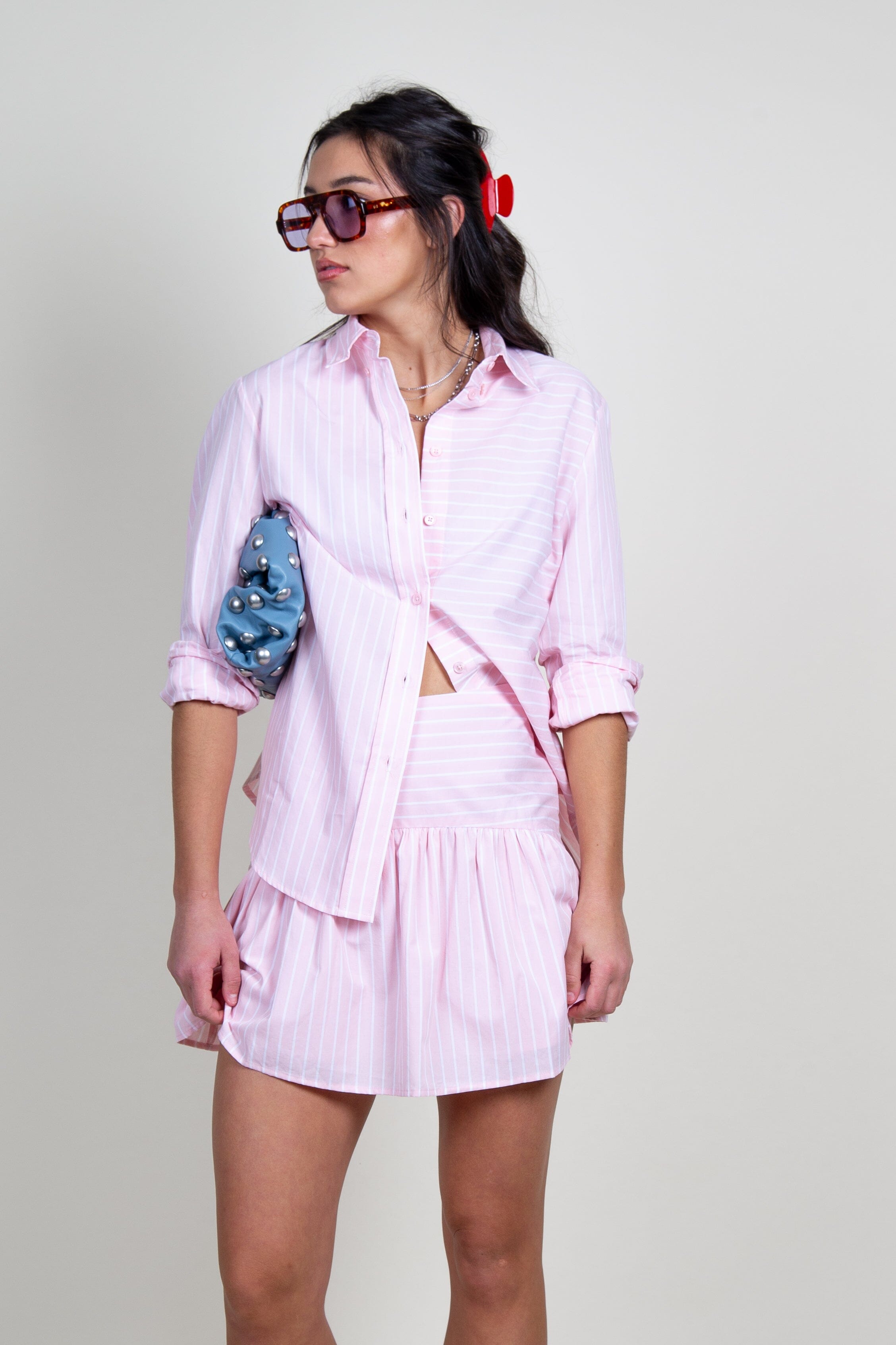 The perfect pink mini, the Katia Skirt is a statement stripe style with a defined waist and soft ruffle detail at the hem.
